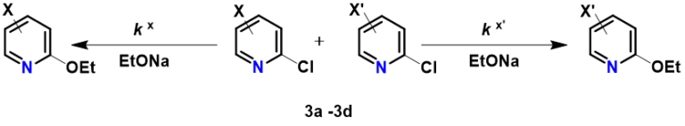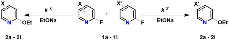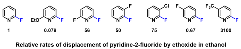 2-Fluoropyridine undergoes SnAr reaction with sodium ethoxide in EtOH about 250 times faster than 2-chloropyridine [1]. The activating effects of various substituents on the displacement of 2-fluoropyridine will be of great interest to medicinal and organic chemists. Schlosser et al [2] reported that by mixing equal amount of 2-fluoropyridine and its substituted analogs and reacting the mixture with sub-stoichiometric amount of sodium ethoxide in ethanol, monitoring the disappearance of the substrates and appearance of products, the relative reaction rate of each reaction substrate relative to 2-fluoropyridine and the relative activation free energy ΔΔG could be calculated (Table 1).