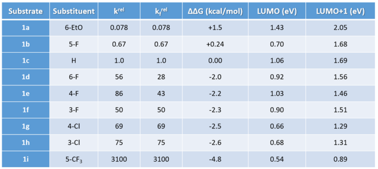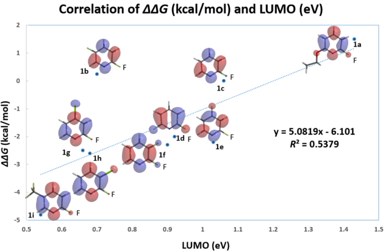 LUMO and LUMO+1 energies of the fluoropyridine substrates, calculated with DFT ωB97X-D/6-31G*, are tabulated. Linear regression analysis on the LUMO orbital energy level versus the relative activation energy obtained from the experiment plot shows poor linear correlation, with a coefficient of determination (R2) of 0.5379 (Figure 1).