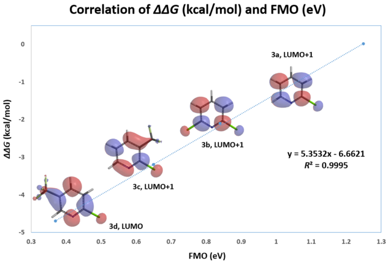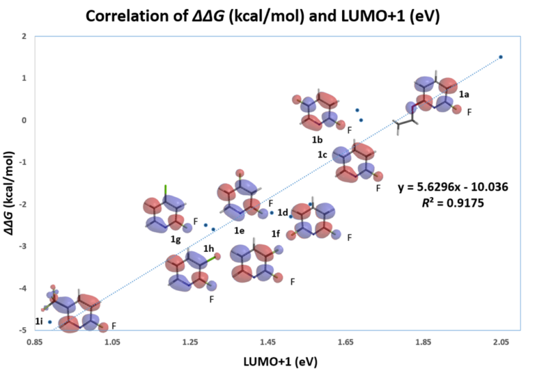 On the other hand, with LUMO+1, there are significant lobes centered on C-F carbon of this set of 2-fluoropyridines (Figure 2). Linear correlation of their LUMO+1 energies and the activation energies is excellent, with a coefficient of determination (R2) of 0.9175, significant improvement as compared to the use of LUMO. This shows that it is necessary to select only the relevant frontier orbitals, and the associated orbital energy values, for reactivity analyses. These are crucial prerequisites for successful Quantum Mechanics-Machine Learning of chemical reactivity and regioselectivity.