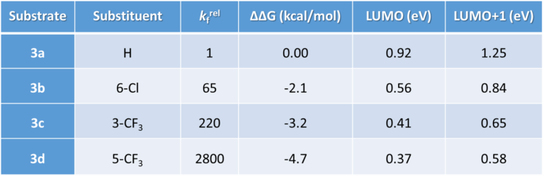 This lesson could be further exemplified with the SnAr reaction of various substituted 2-chloropyridines. Excellent linear correlation (R2 of 0.9995) of reactivity with relevant LUMO or LUMO+1 orbital energy, chosen with an orbital lobe centered on the C-Cl carbon (Figure 3, Table 2). Relevant orbitals for correlation of a set of electrophiles with reactivity could be a mix of LUMO and LUMO+n. We need to choose the appropriate ones first.