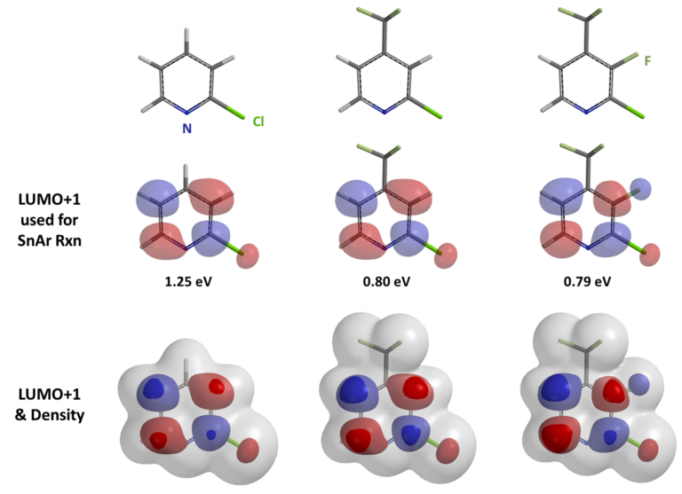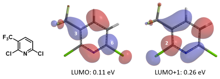 Shown below are LUMO+1 of three 2-chloropyridine analogs and their overlays with respective electron cloud density maps. Note the effects of sequential introduction of trifluoromethyl and fluoro groups on LUMO+1 energy and lobe distribution, in particular at C2 and C3 carbons. It should become obvious why SnAr of 2-chloro-3-fluoro-4-trifluoromethylpyridine proceeds selectively at C3, not at C2.