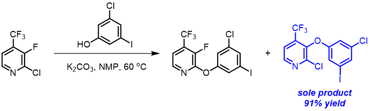 In the textbook “Heterocyclic Chemistry”[5], the authors taught us that nucleophilic substitution of 3-halopyridine is too slow for practical use. However, in the synthesis of Doravirine, a non-nucleoside reverse transcriptase inhibitor (NNRTI) for the treatment of HIV-1 infection, reaction of 3-chloro-5-iodophenol with 2-chloro-3-fluoro-4-trifluoromethyl-pyridine provides selectively the C3 substituted product [6], no displacement of the “potentially” more reactive C2 chloride is observed.
