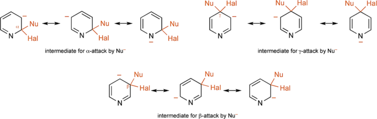 [5] J. A. Joule & K. Mills. Heterocyclic Chemistry 5th Ed. Chichester, West Sussex, UK: Blackwell Publishing Ltd., 2010; pp 118. Such substitutions follow the same mechanistic route as the displacement of halide from 2- and 4-halonitro-benzenes, i.e., the nucleophile first adds and then the halide departs. By analogy with the benzenoid situation, the addition is facilitated by: (i) the electron – deficiency at α- and γ-carbons, further increased by the halogen substituent, and (ii) the ability of the heteroatom to accommodate negative charge in the intermediate thus produced. A comparison of the three possible intermediates makes it immediately plain that this latter is not available for attack at a β-position, and thus β nucleophilic displacements are very much slower – for practical purposes they do not occur.