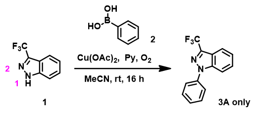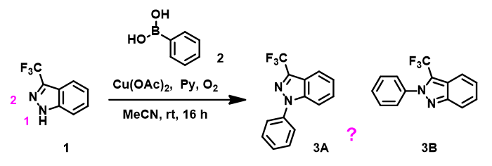 Figure 1. Chan-Lam reaction between indazole 1 and phenylboronic acid 2.