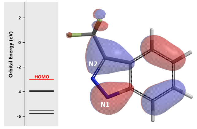 Shown on Figure 3 is HOMO of indazole 1 anion. There is significant HOMO lobe on N1, but almost nothing on N2, suggesting that Chan-Lam reaction will occur preferentially at N1. The determining factor in this reaction is electronic effect, rather than the potential steric interaction from the CF3 group.