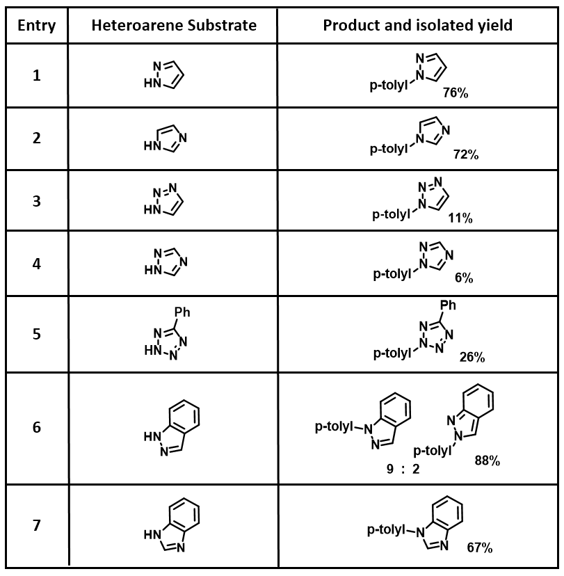 Table 1. Chan-Lam reaction between various heterocycles and p-tolylboronic acid[2a].