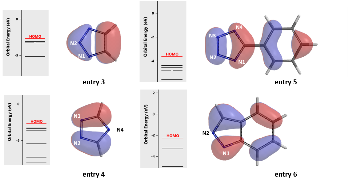 Next we collected additional examples from the literature for analysis[2]. Pyrazole (Table 1, entry 1), imidazole (entry 2), and benzimidazole (entry 7) do not require analyses for regioselectivity[2a]. HOMO of 1,2,3-triazole anion (Table 1 & Figure 5, entry 3) suggests Chan-Lam reaction will proceed predominately on N2, to a lesser extent on N1, in contrast to reported N1 arylation product only [2a]. Perplexing!