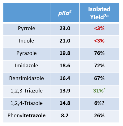 Chan-Lam Reaction is sensitive to the nature of heterocyclic substrates[2a]. For example, pyrrole and indole failed to react with p-tolylboronic acid, and the more acidic triazole and tetrazole did not react well. We learned that deprotonation of the NH proton on the heterocyclic ring and the coordination of the resultant anion onto Cu(II) A are crucial steps in the reaction. Tabulated on Table 2 are pKa of heterocyclic substrates and isolated yields for the reaction under standard conditions (pyridine as base and ligand at 25ºC). From your experience, what pKa range the heterocyclic substrates need to fall within for Chan-Lam reaction to be feasible?