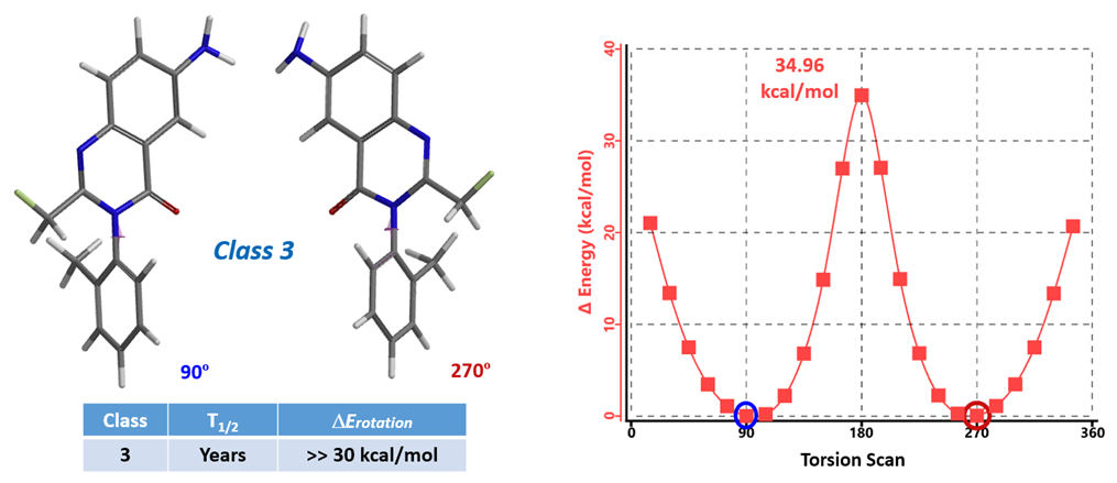 Class 3: DERot > 30 kcal/mol, T1/2 in years, the atropisomer is very stable, separable with chiral SFC, could be developed as a single compound.