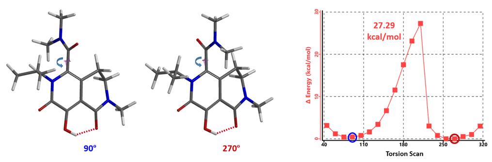 MK-0536 atropisomerism comes from restricted rotation of the C-C bond marked with the red arrow (Figure 5). QM torsion scan shows that when the two lowest conformations have dihedral angle of 90º and 270º, respectively, the energy barrier for their interconversion is 27.29 kcal/mol (Figure 6, the N-benzyl group is simplified to N-methyl group for calculation). As such, MK-0536 belongs to class 2 atropisomer. Under normal conditions, half-life of interconversion will be in days.