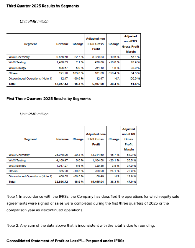 (SHANGHAI, October26, 2025) – WuXi AppTec (stock code: 603259.SH / 2359.HK), a global company that provides a broad portfolio of R&D and manufacturing services to enable companies in the pharmaceutical and life sciences industry, today announced financial results for the first three quarters ending September 30, 2025 (“Reporting Period”):