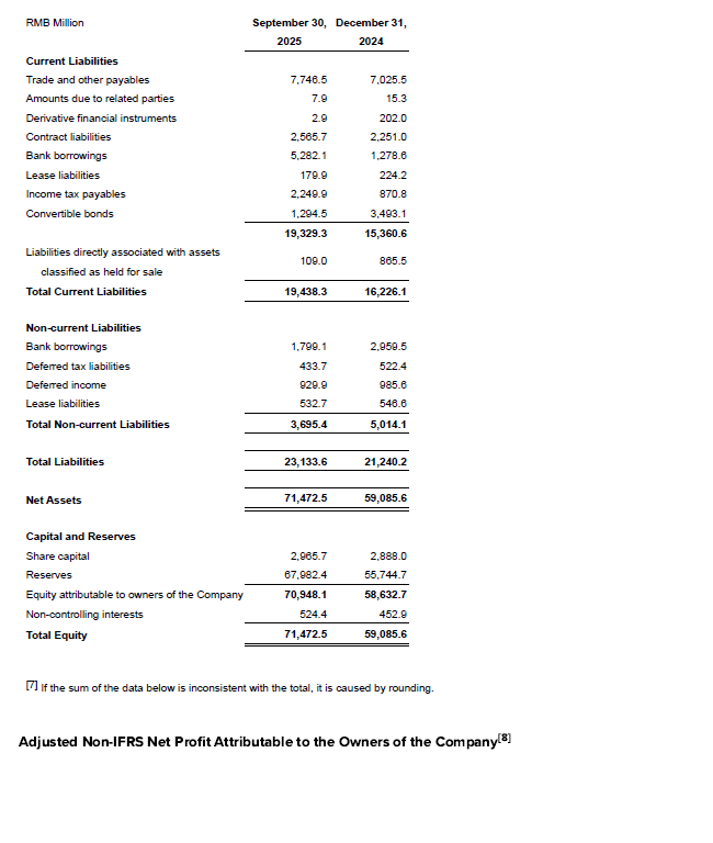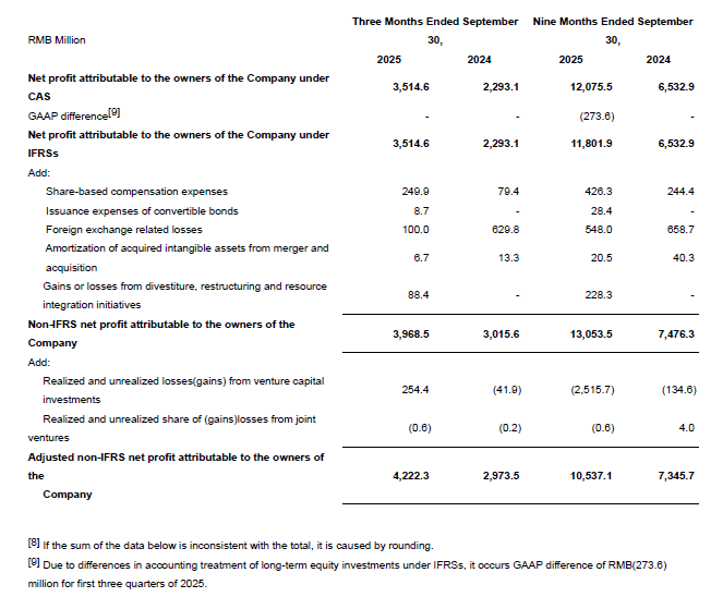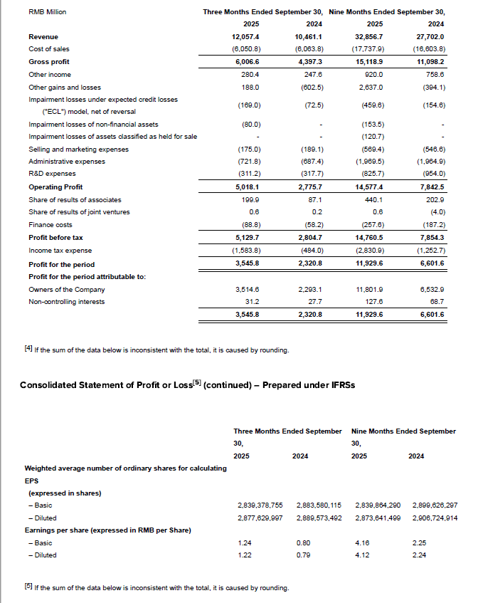 Adjusted non-IFRS net profit attributable to the owners of the Company was RMB10.54 billion, up 43.4% year-over-year; adjusted non-IFRS net profit margin up 5.6pts year-over-year to 32.1%; adjusted non-IFRS diluted EPS was RMB3.68, up 46.0% year-over-year.